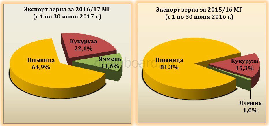 Структура экспорта зерна в июне 2017 (с 1 по 30 июня) отличается от экспорта аналогичного периода 2016 года. С 1 по 30 июня 2017 г. пшеница в структуре занимает 64,9% (против 81,3% в 2016 году), кукуруза занимает второе место по объемам, составляя 22,1% (против 15,3% в 2016 году). Экспорт ячменя составил 11,6%, а за аналогичный период прошлого года экспорт культуры практически отсутствовал и составлял 1% от общего объема